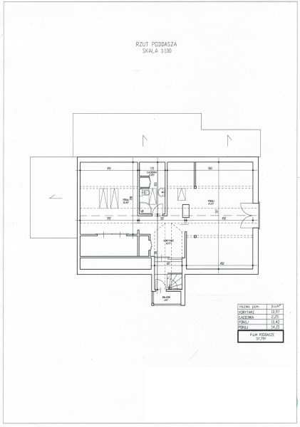 Pierwsze piętro: O powierzchni 38 m² (ze skosami), znajdują się tutaj dwie sypialnie, łazienka z kabiną prysznicową oraz balkon, z którego rozciąga się widok na okoliczną zieleń. Dodatkowo do dyspozycji jest korytarz.