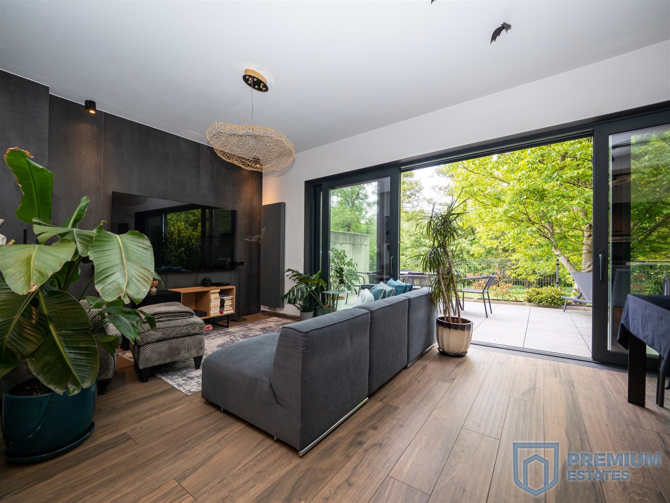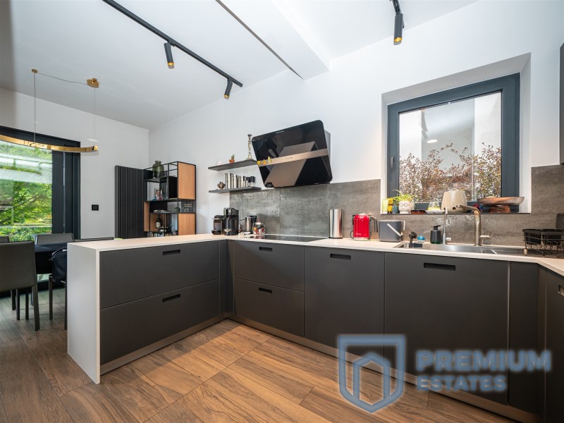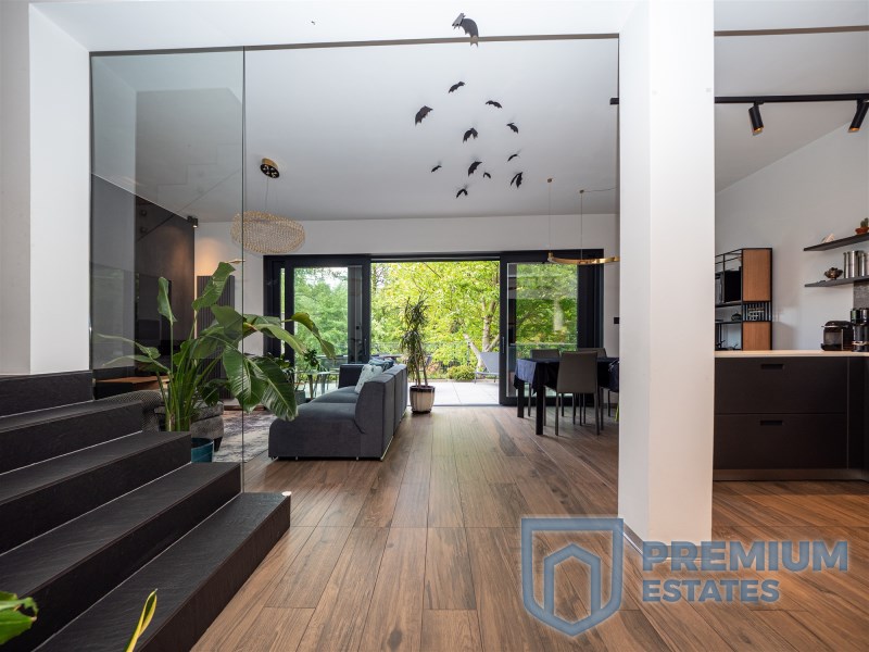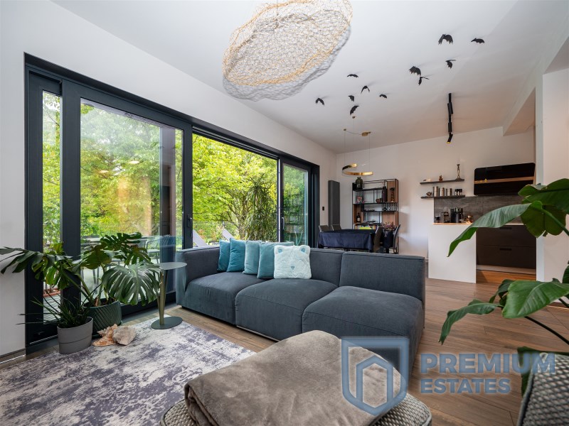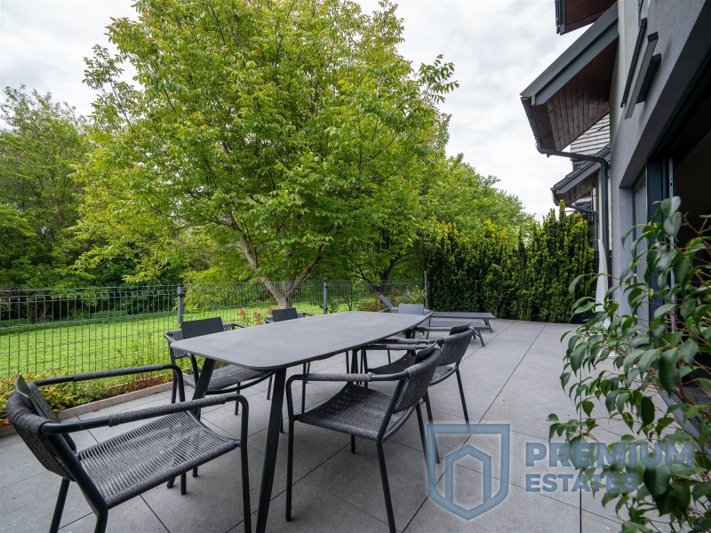 The terrace and living room are connected by a sliding HST window without a threshold. It is equipped with high-quality garden furniture and a Planika fireplace. The terrace provides the property with privacy and a view of the greenery, without the possibility of development in the future.