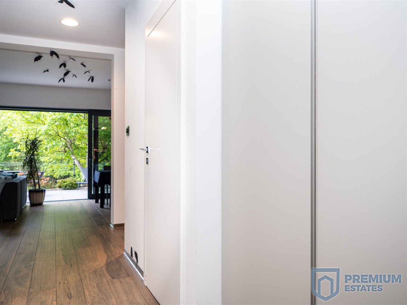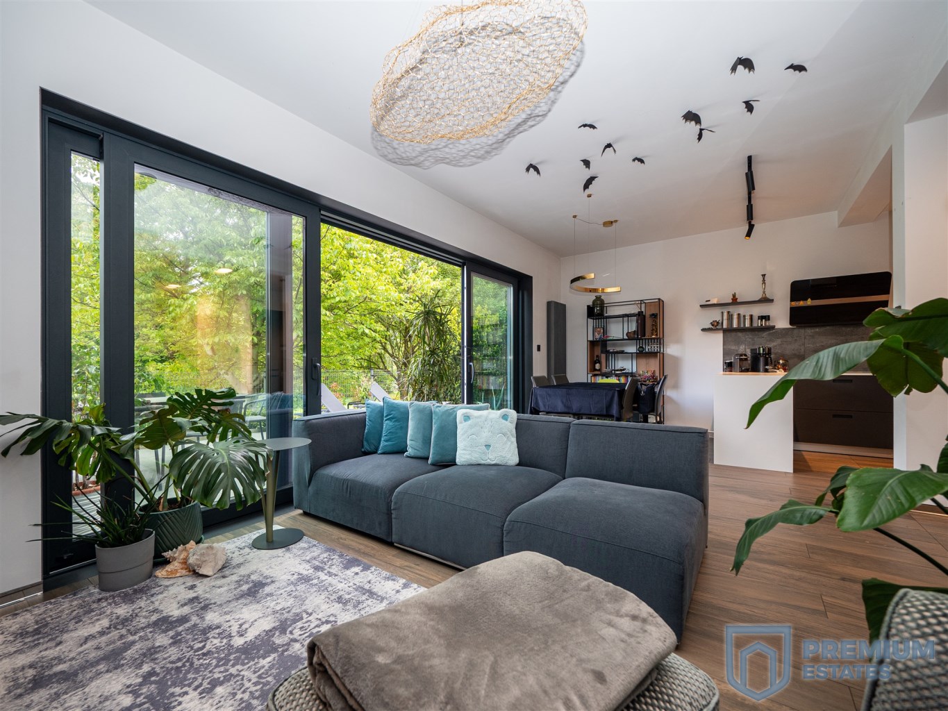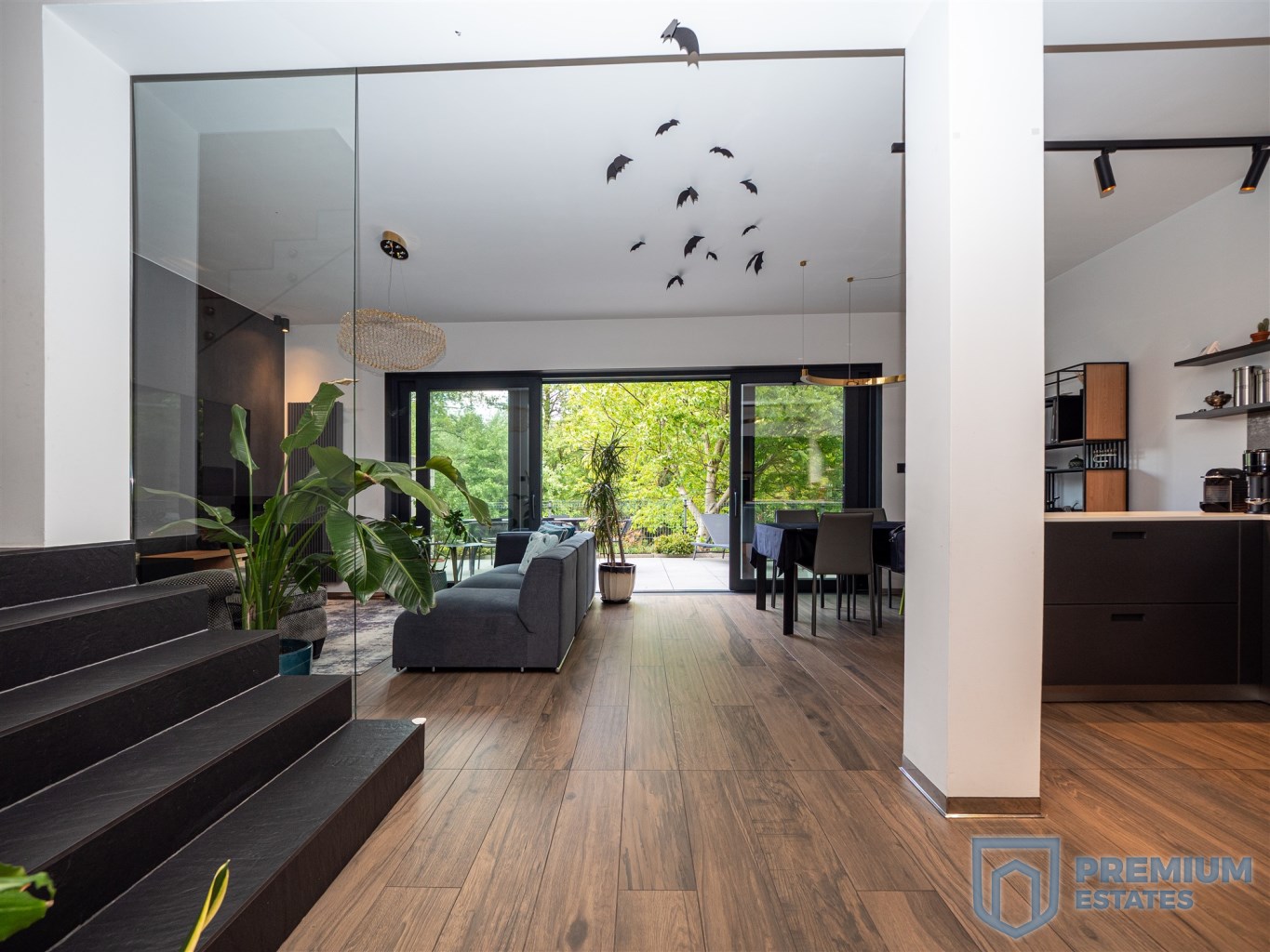 The terrace and living room are connected by a sliding HST window without a threshold. It is equipped with high-quality garden furniture and a Planika fireplace. The terrace provides the property with privacy and a view of the greenery, without the possibility of development in the future.