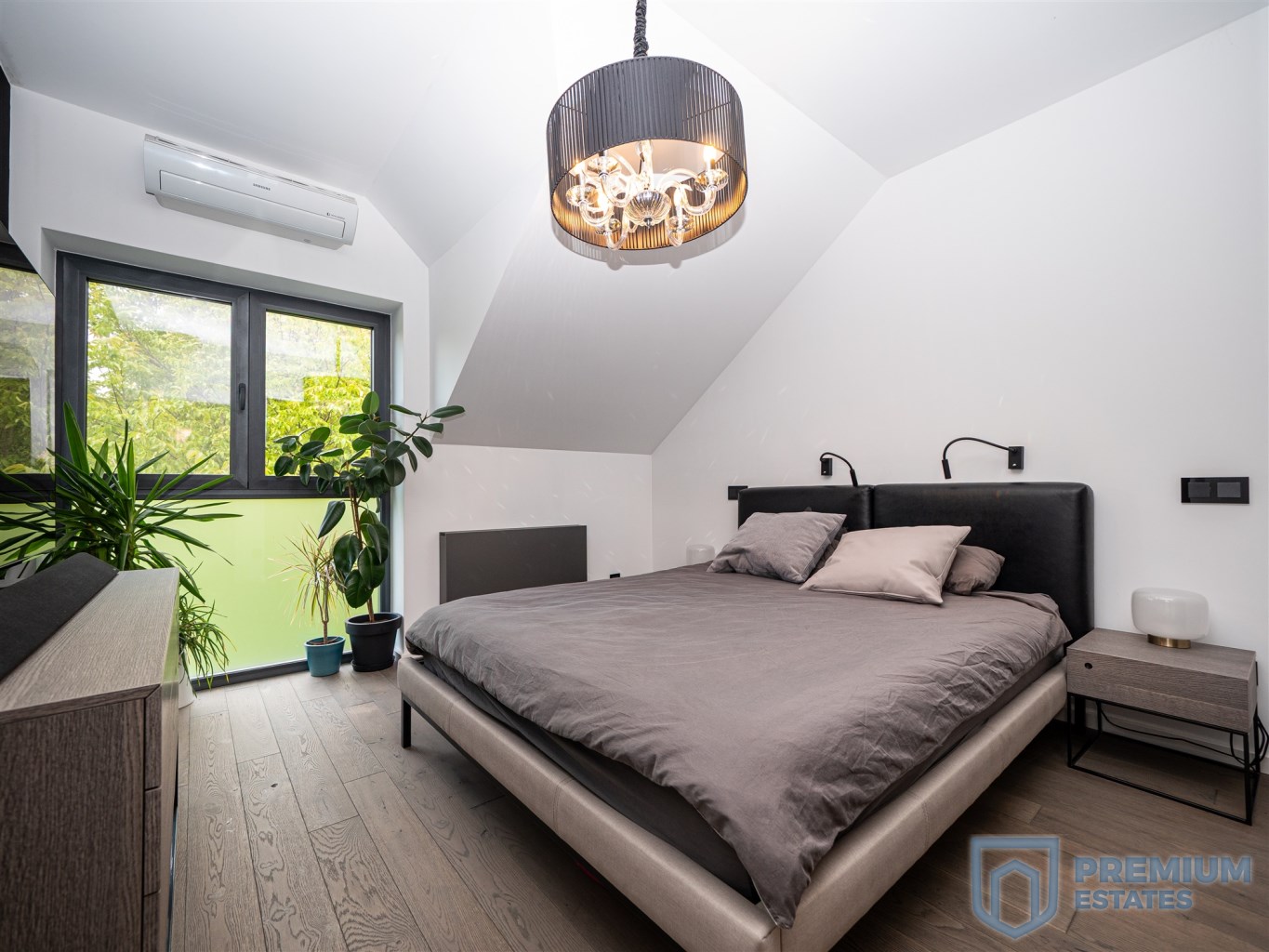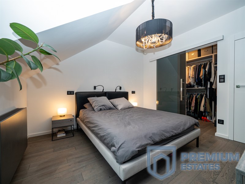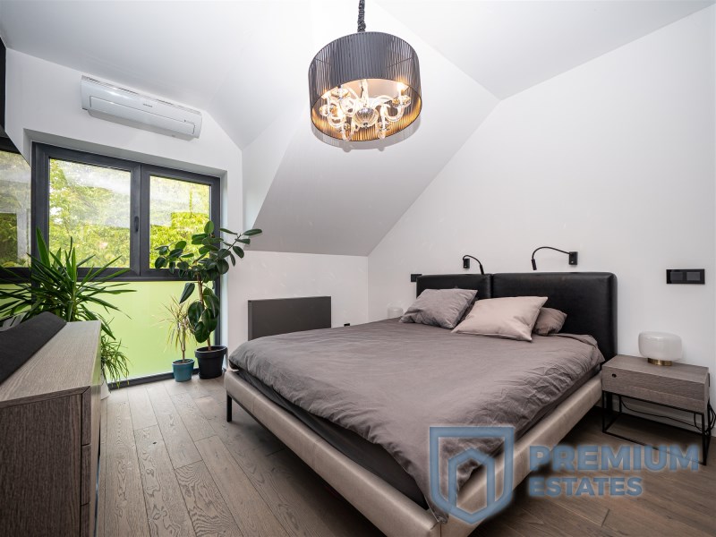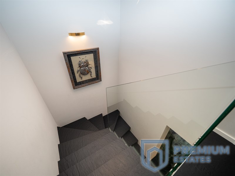 Piętro: podłogi w pokojach są wykończone deską orzechową olejowaną, w sypialni głównej ściana multimedialna jest pokryta czarną tapetą, dużym atutem sypialni jest przynależna do niej przeszklona garderoba. Na piętrze znajduje się również duży przestronny pokój dziecka z widokiem na zieleń. Trzeci pokój na piętrze służący obecnie jako gabinet posiada przeszklone trójkątne okno, a dzięki jego dużej powierzchni sprawdzi się również jako kolejne pomieszczenie będące trzecią sypialnią. Łazienka minimalistyczna wykończona płytkami o naturalnym kolorze imitującym kamień, podwójna umywalka z konglomeratu, wszystkie baterie i deszczownica firmy Noken Porcelanosa.