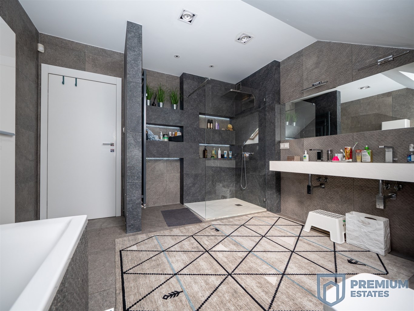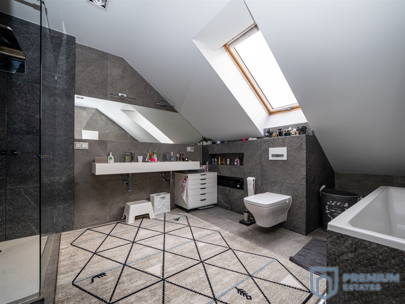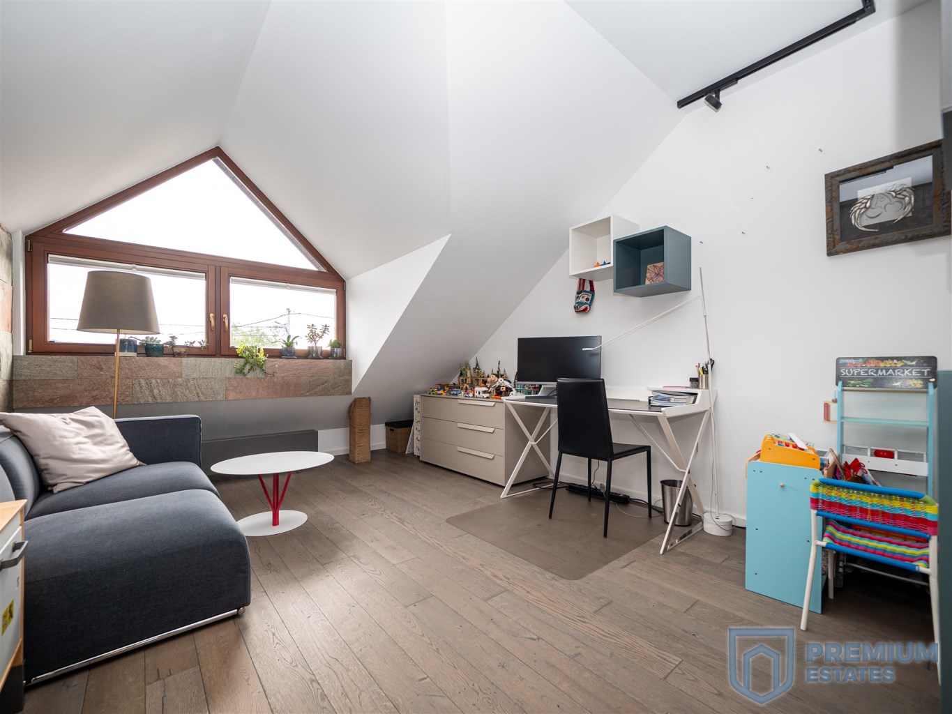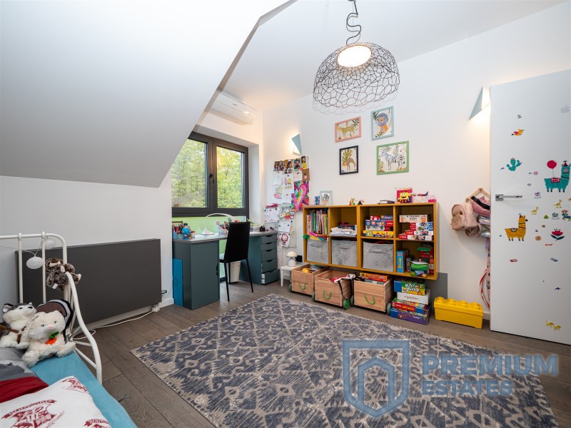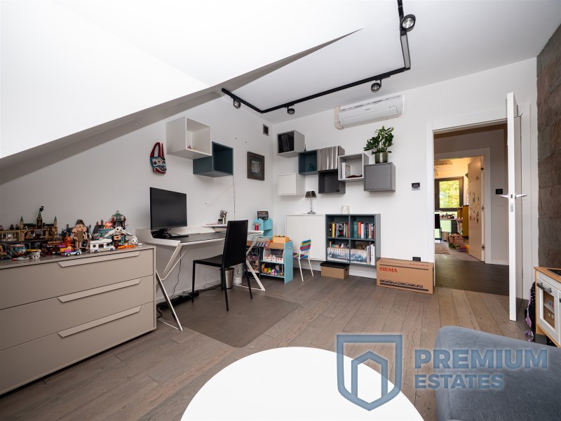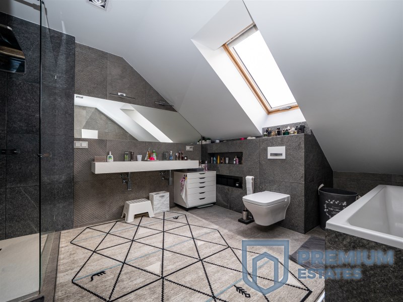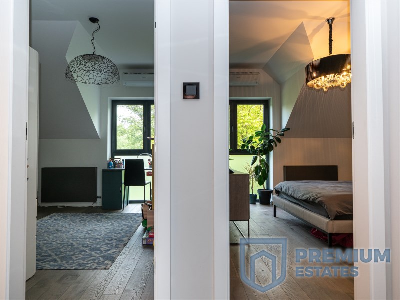 First floor: the floors in the rooms are finished with oiled walnut boards, in the master bedroom the multimedia wall is covered with black wallpaper, a big advantage of the bedroom is the glass wardrobe belonging to it. On the first floor there is also a large spacious children's room with a view of the greenery. The third room on the first floor, currently serving as an office, has a glass triangular window, and thanks to its large area it will also work as another room serving as a third bedroom. Minimalist bathroom finished with tiles in a natural color imitating stone, double sink made of conglomerate, all faucets and a rain shower by Noken Porcelanosa.