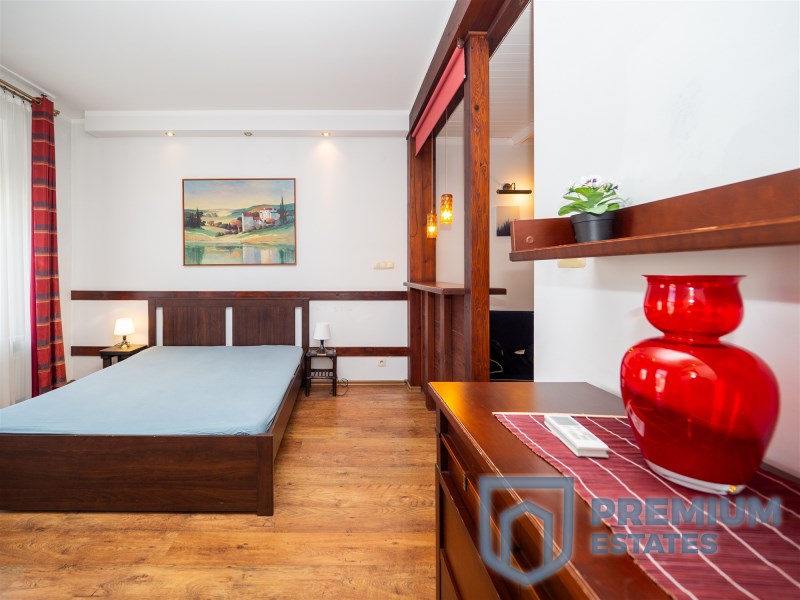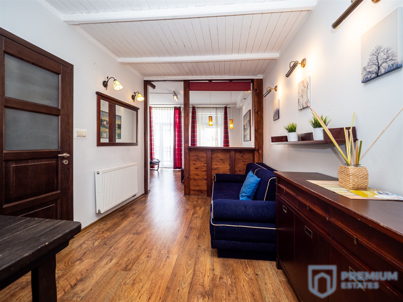 Wnętrze zaprojektowane jest w eleganckim stylu Art Deco. Duże meble z ciemnego dębu, w tym komody, szafki oraz stół jadalniany z ławkami, podkreślają wyjątkowy charakter przestrzeni. Ściany zdobią malownicze obrazy, co nadaje wnętrzu artystycznego klimatu.