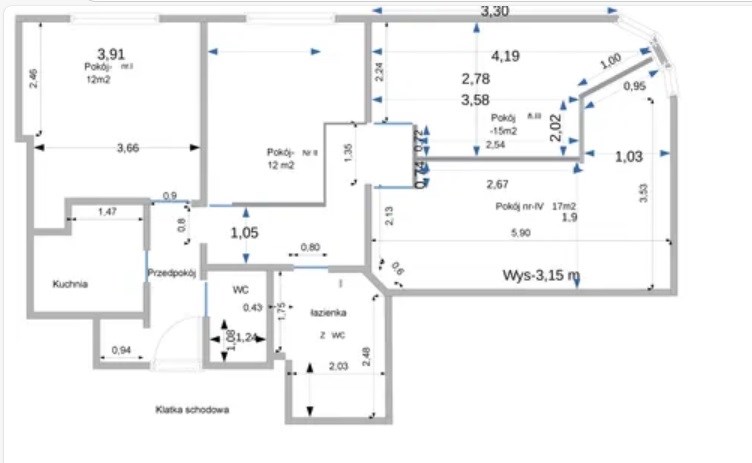 - 4 oddzielnych pokoi (17,5m2, 17m2, 12,7m2, 9,5m2),