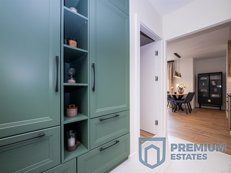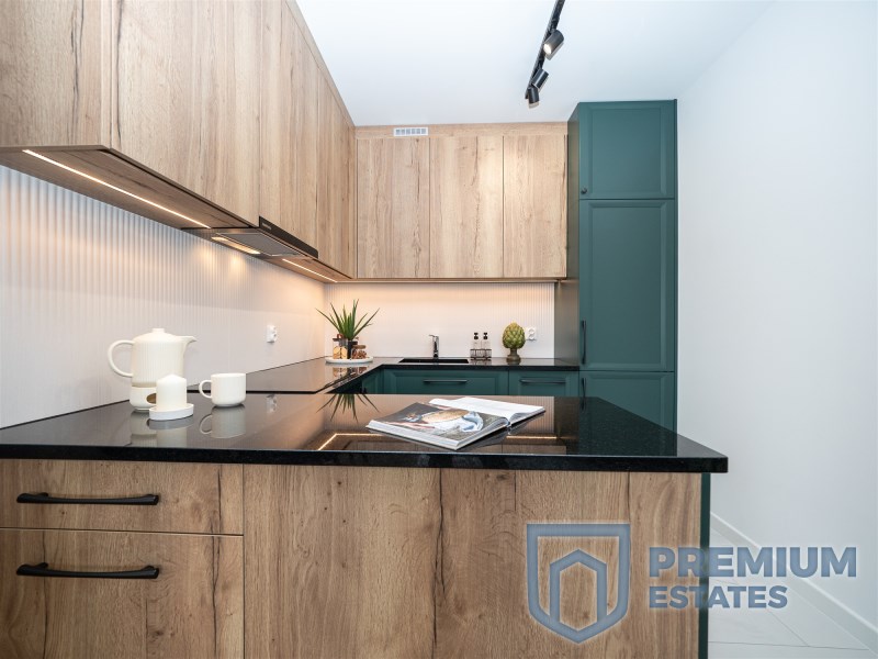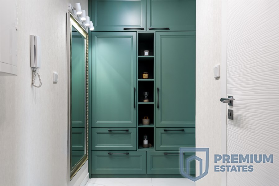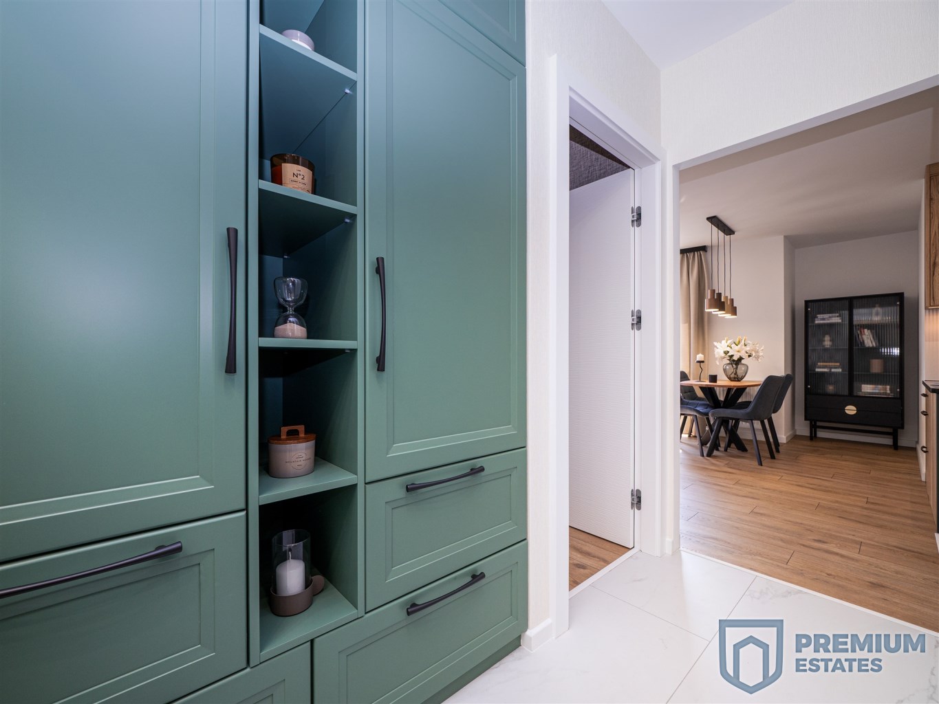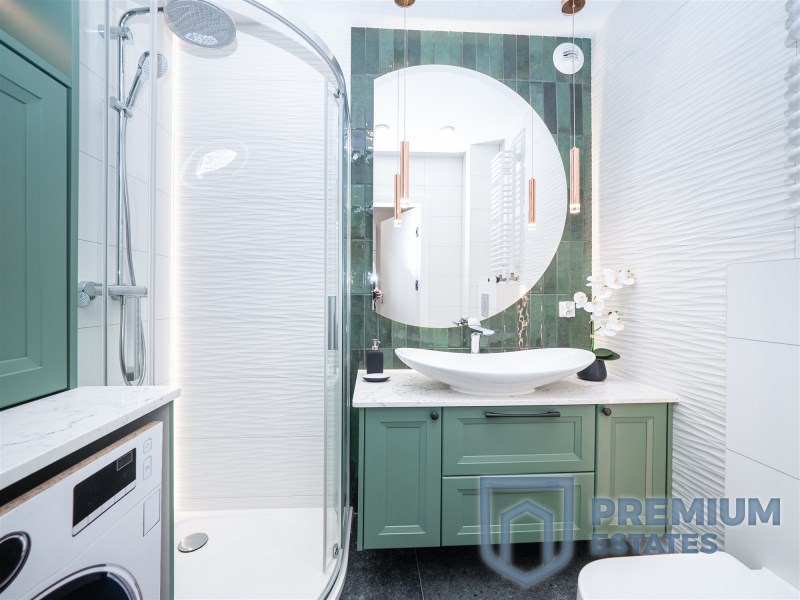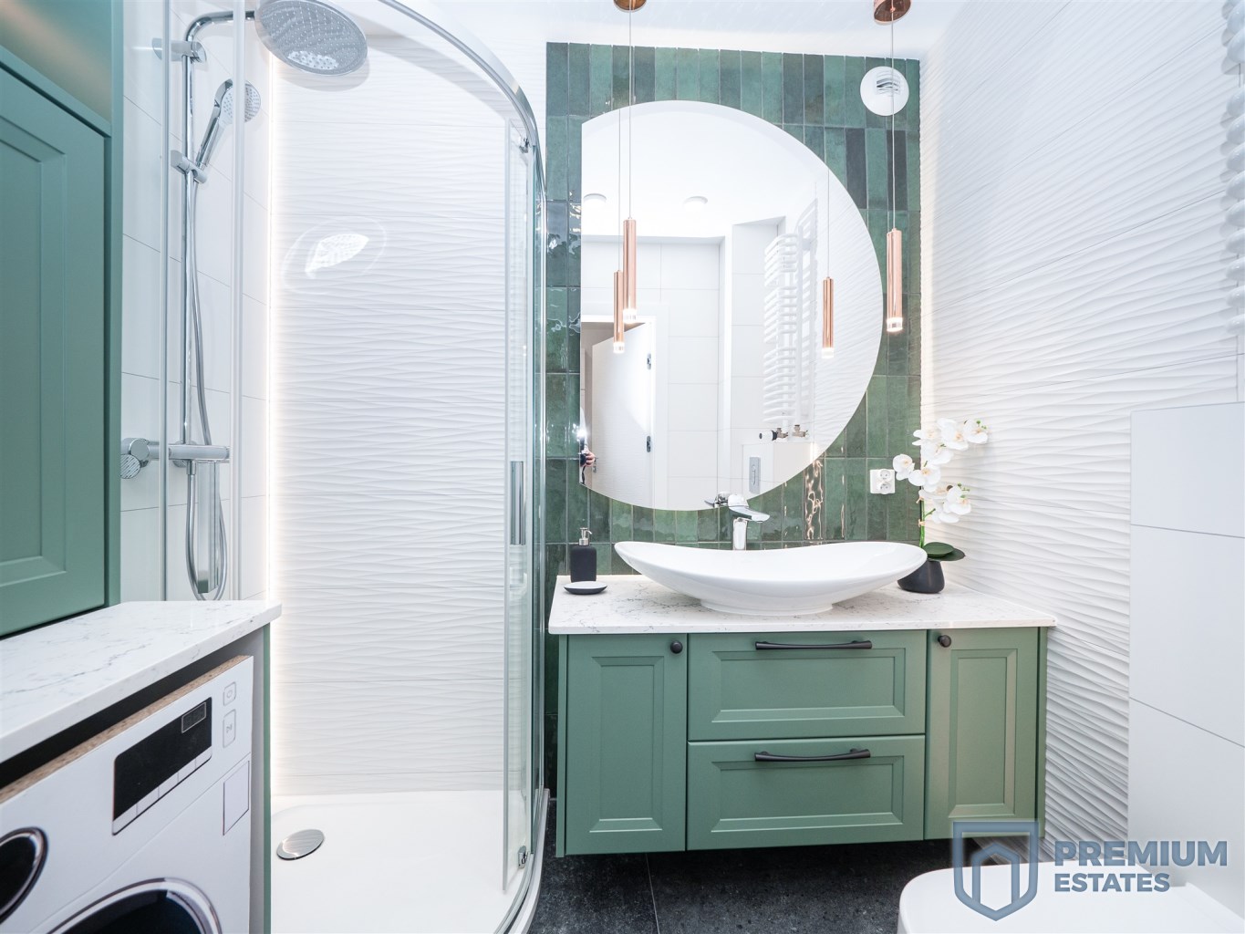 The interior has been finished to a high standard in elegant deep green tones, using premium materials and brands such as Villeroy & Boch, Grohe, KLUDI, Roca, Hansgrohe, SIRPI, Wallfashion, and Alsapan.