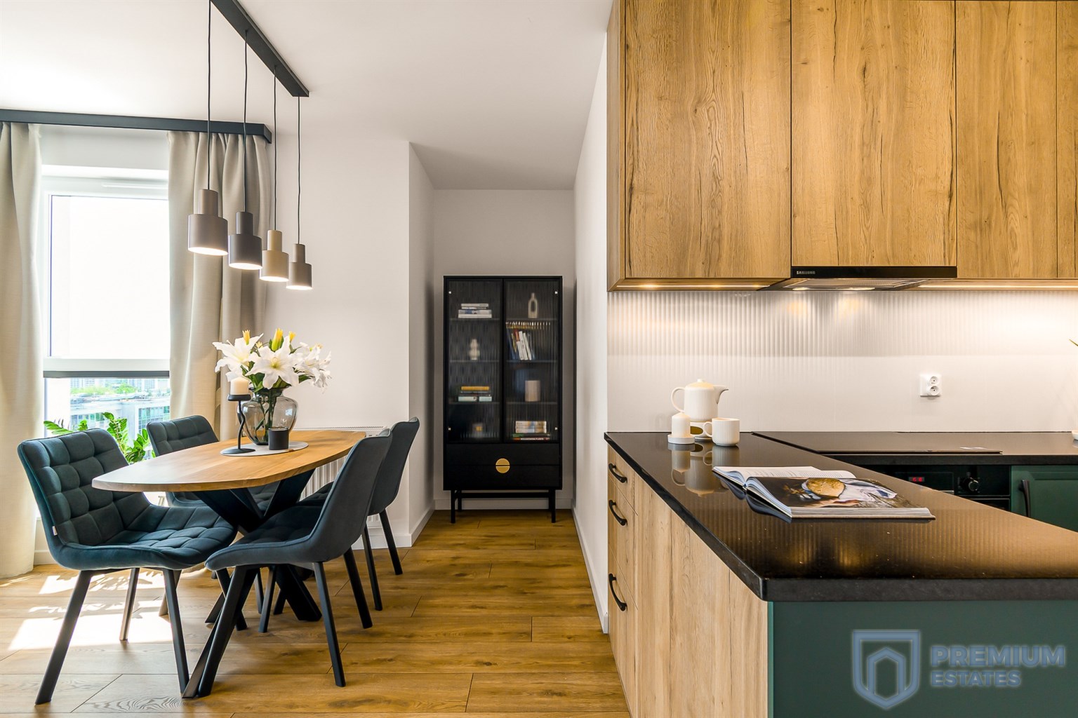 Wnętrze zostało wykończone w wysokim standardzie, w eleganckiej kolorystyce butelkowej zieleni. Zastosowano materiały renomowanych marek, m.in. Villeroy & Boch, Grohe, KLUDI, Roca, Hansgrohe, SIRPI, Wallfashion oraz Alsapan.