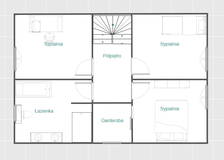 Piętro: podłogi w pokojach są wykończone deską orzechową olejowaną, w sypialni głównej ściana multimedialna jest pokryta czarną tapetą, dużym atutem sypialni jest przynależna do niej przeszklona garderoba. Na piętrze znajduje się również duży przestronny pokój dziecka z widokiem na zieleń. Trzeci pokój na piętrze służący obecnie jako gabinet posiada przeszklone trójkątne okno, a dzięki jego dużej powierzchni sprawdzi się również jako kolejne pomieszczenie będące trzecią sypialnią. Łazienka minimalistyczna wykończona płytkami o naturalnym kolorze imitującym kamień, podwójna umywalka z konglomeratu, wszystkie baterie i deszczownica firmy Noken Porcelanosa.