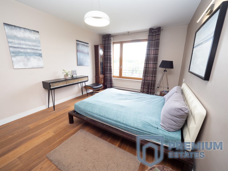 Mieszkanie jest wykończone z dbałością o najmniejszy szczegół oraz wyposażone sprzęt najwyższej klasy. Dwustronna ekspozycja wschód -zachód sprawia, że w mieszkaniu jest bardzo jasno przez cały dzień. Na podłodze solidny dąb palony. Ogrzewanie oraz woda z sieci miejskiej. Do mieszkania przynależy miejsce postojowe w garażu podziemnym oraz komórka lokatorska znajdująca się na tym samym piętrze.