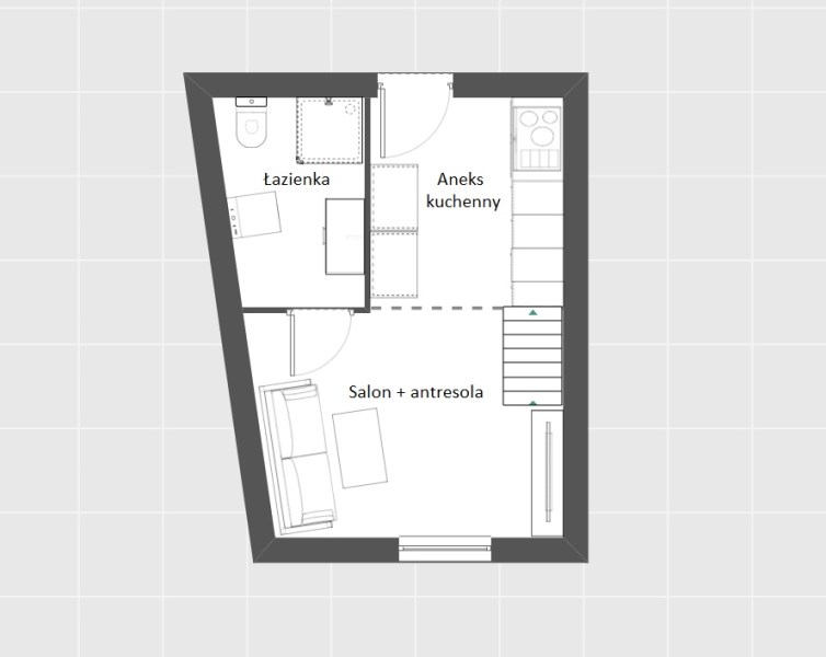 strefa dzienna z antresolą sypialnianą