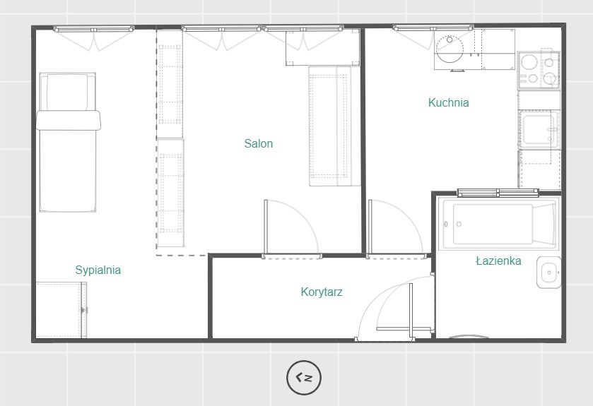 Składa się z : dużego, jasnego pokoju, osobnej kuchni, łazienki i przedpokoju i małego balkonu.