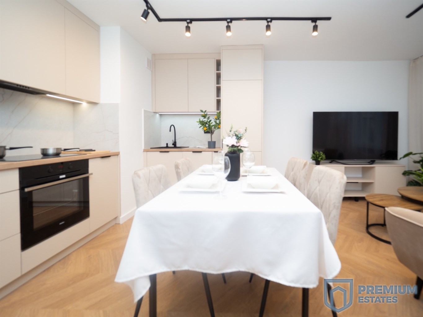 Kuchnia w zabudowie wyposażona jest w nowe AGD: piekarnik, płytę indukcyjną, zmywarkę oraz lodówkę.