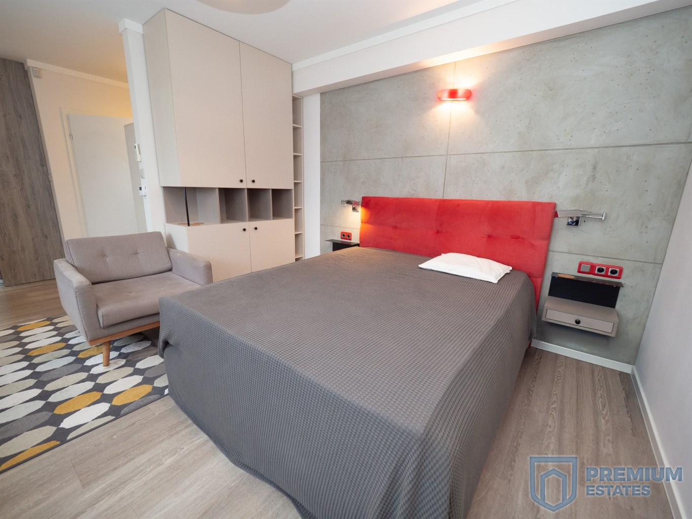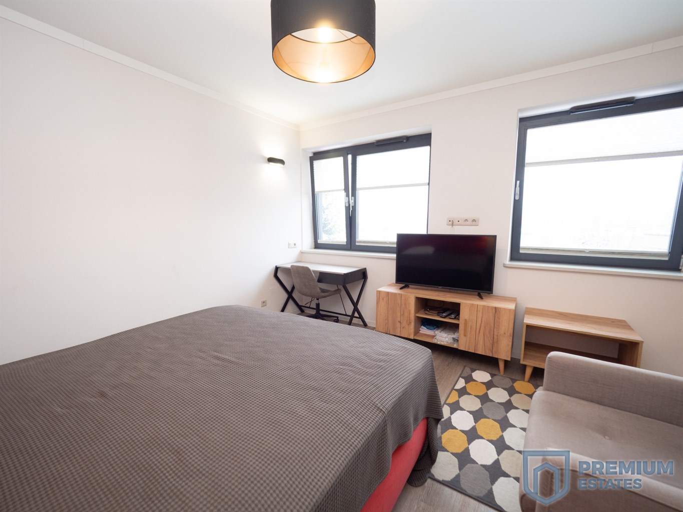 - salon: telewizor, komoda, szafka, szafa w zabudowie, podwójne łóżko, stolik RTV,
