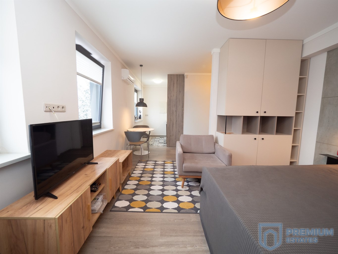 - living room: TV, chest of drawers, cabinet, built-in wardrobe, double bed, TV stand,