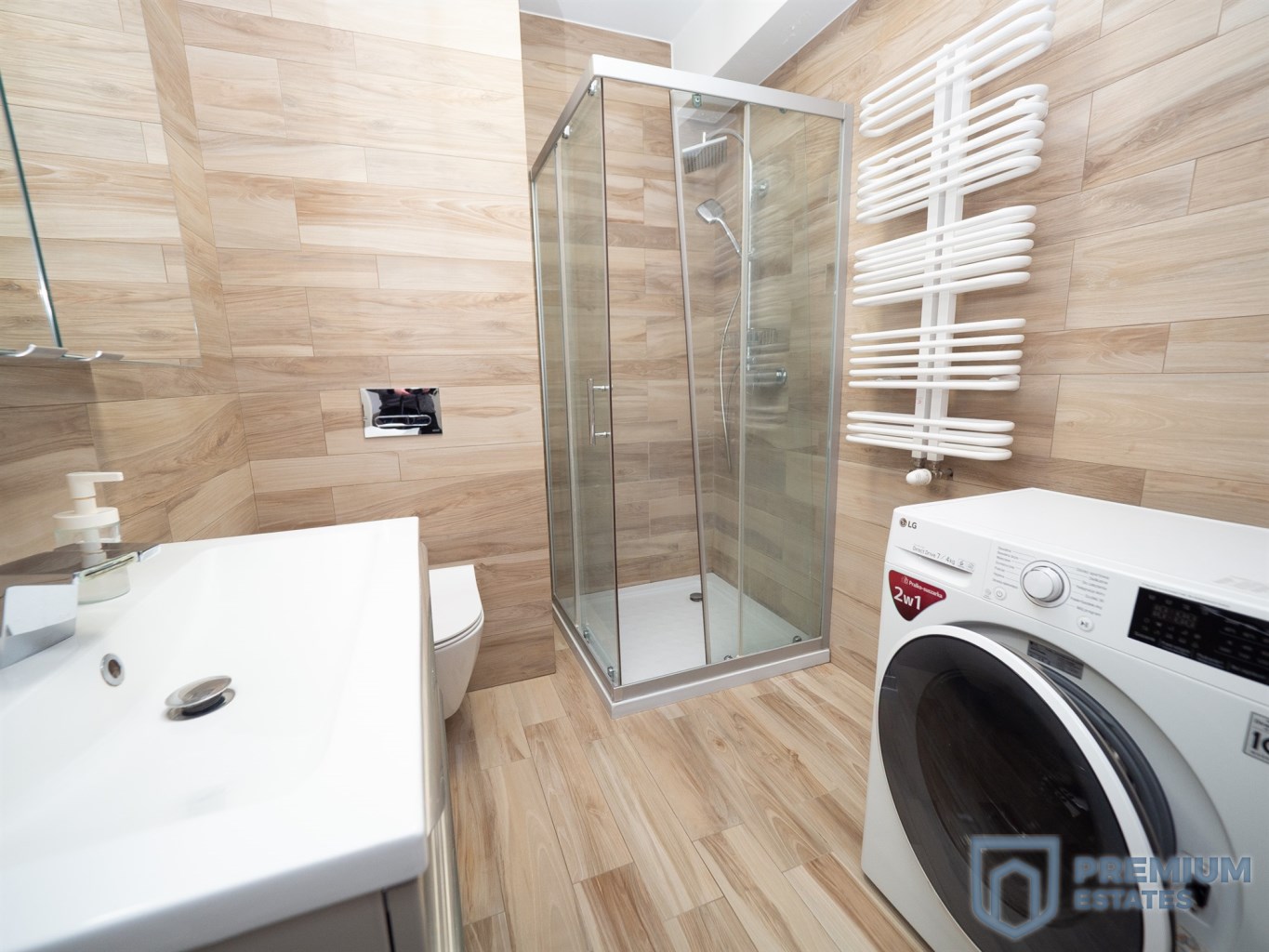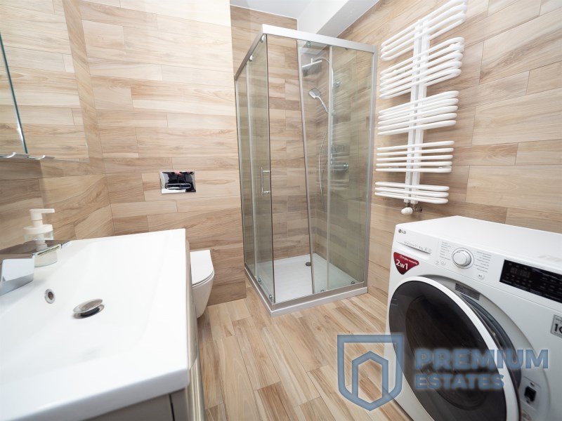 - łazienka z prysznicem, umywalką, toaletą oraz pralką,