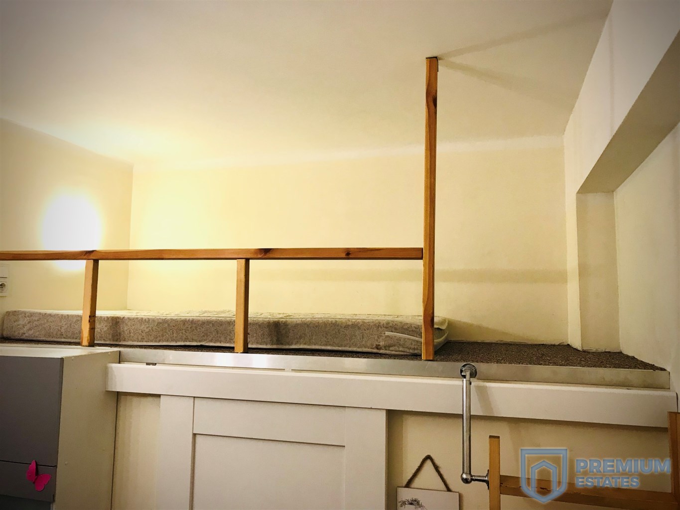 - a living room with a kitchenette and a mezzanine with a mattress
