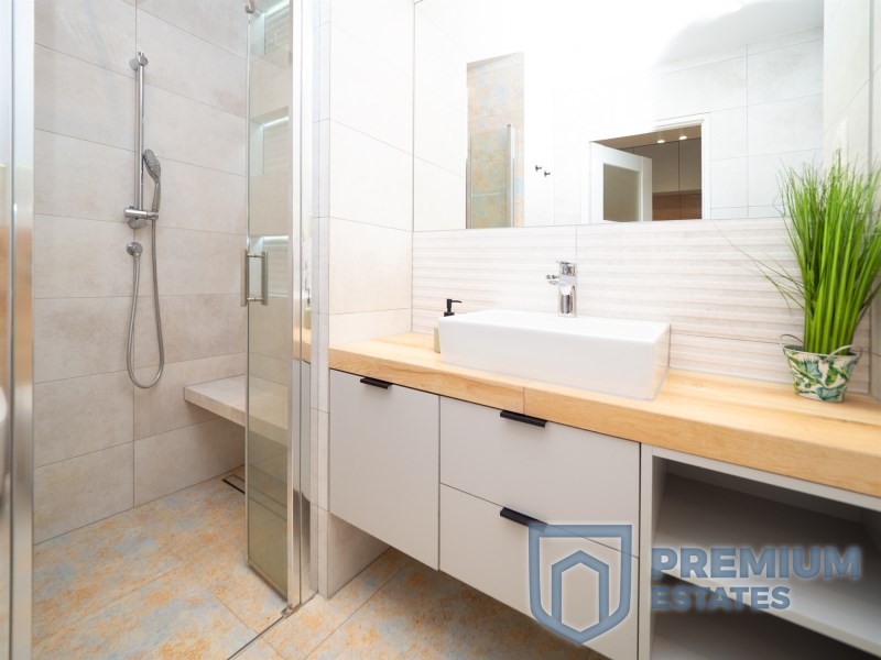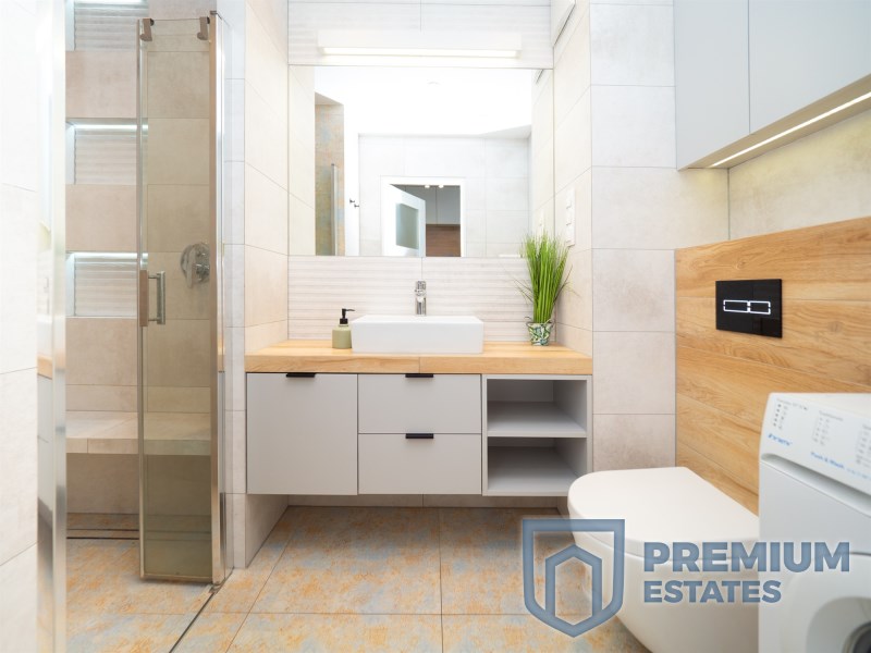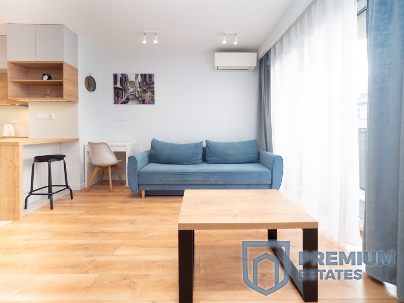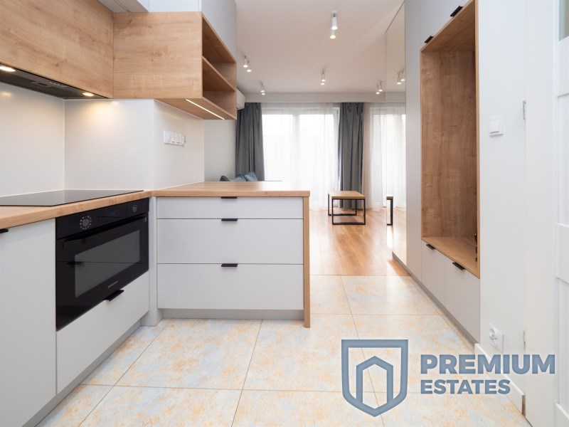 The apartment has an area of 27 m² and is located on the 1st floor of a low-rise building from 2019, without an elevator. The studio consists of a living area with a kitchenette, a bathroom and a hallway. The interior is finished in a modern style and fully equipped. The kitchenette includes an induction hob and an oven with a microwave function. The bathroom features a shower and underfloor heating. Air-conditioned apartment, fully furnished and ready to move in.