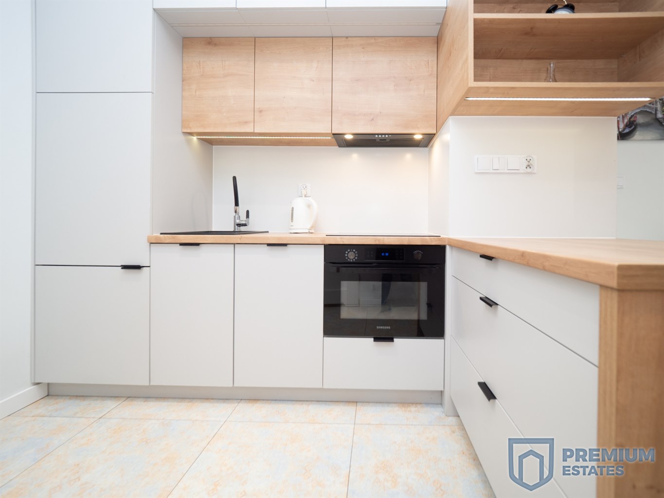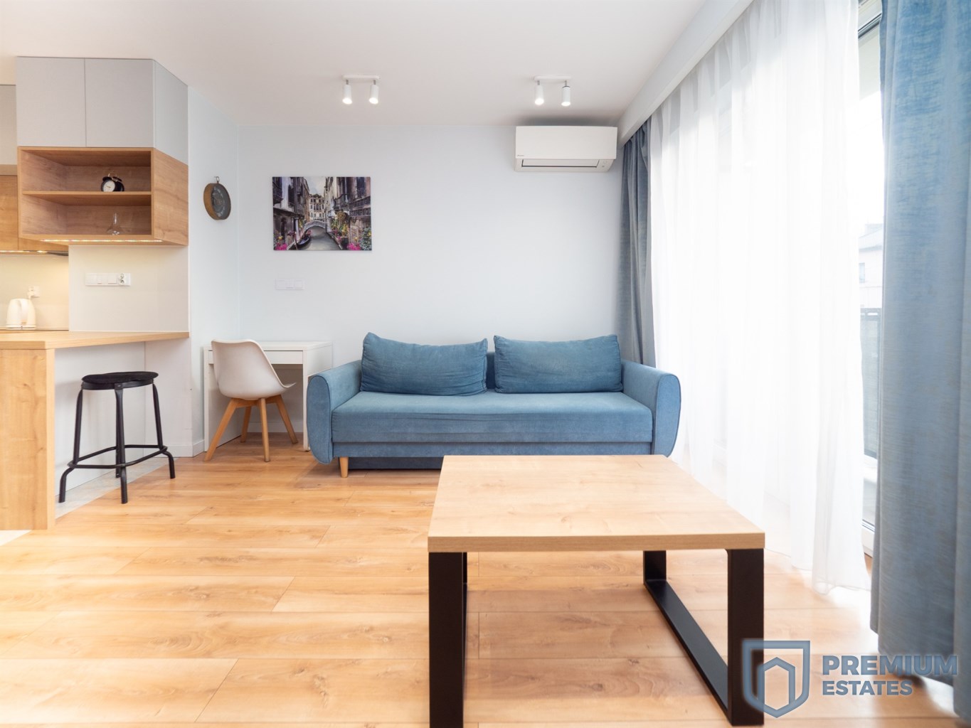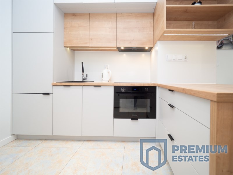 Wnętrze zostało urządzone w nowoczesnym stylu i wyposażone w wysokiej jakości sprzęty. Aneks kuchenny posiada płytę indukcyjną oraz piekarnik z funkcją mikrofali. Łazienka wyposażona jest w prysznic oraz ogrzewanie podłogowe. Mieszkanie klimatyzowane, w pełni umeblowane i gotowe do zamieszkania.