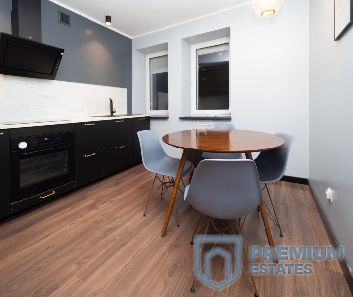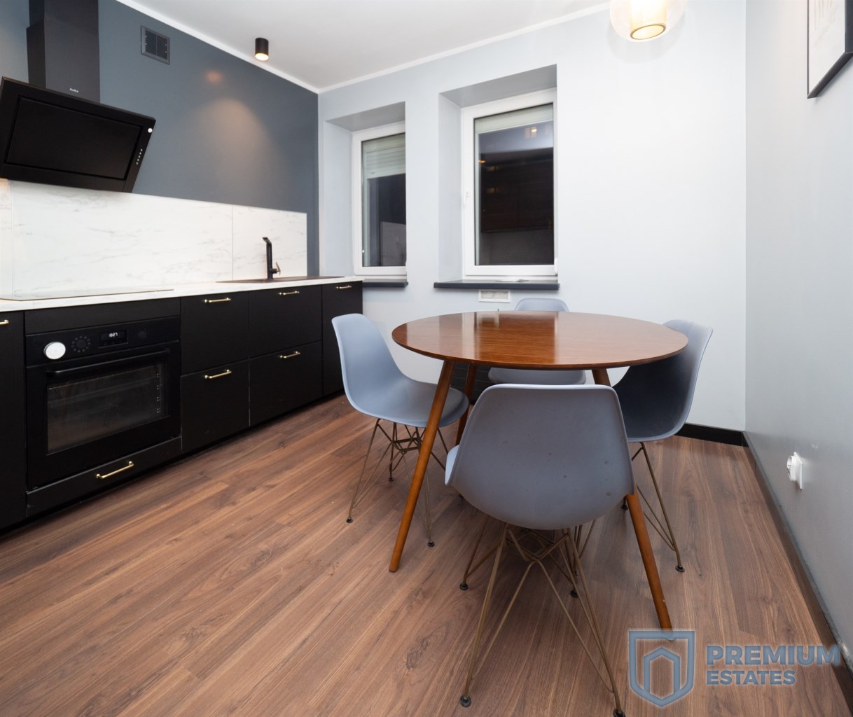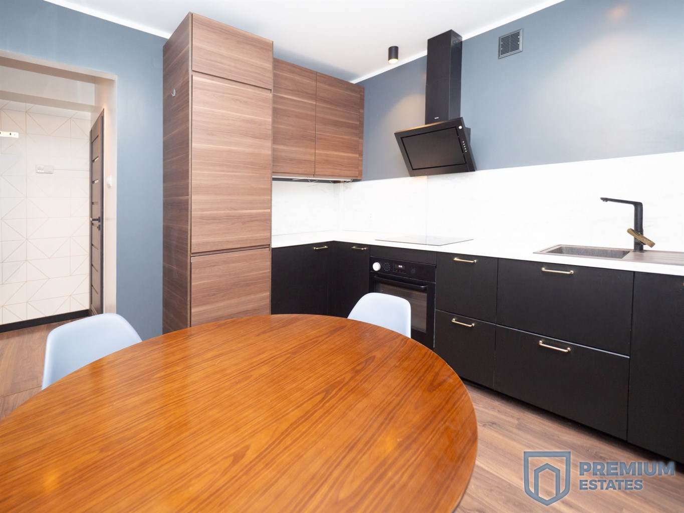 Oddzielna kuchnia została wyposażona w lodówkę w zabudowie, płytę indukcyjną, zmywarkę, pralkę, wygodny okrągły stół oraz dużą ilość szafek, które zapewniają maksymalny komfort.