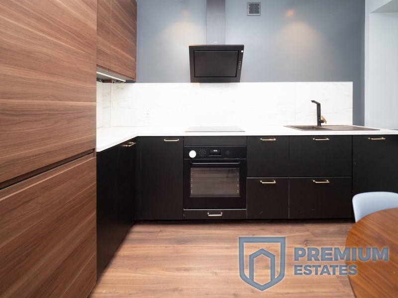 Окрема кухня обладнана вбудованим холодильником, індукційною плитою, посудомийною машиною, пральною машиною, зручним круглим столом і великою кількістю шафок для максимальної функціональності.