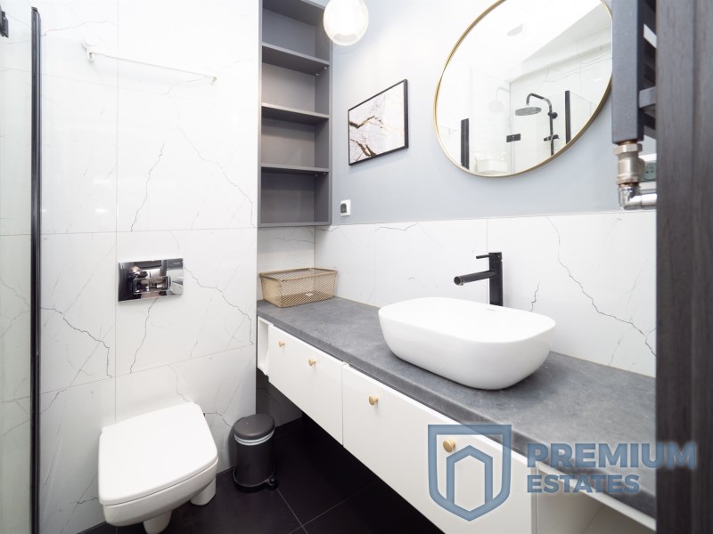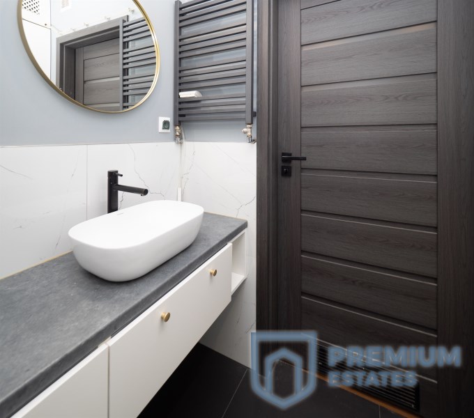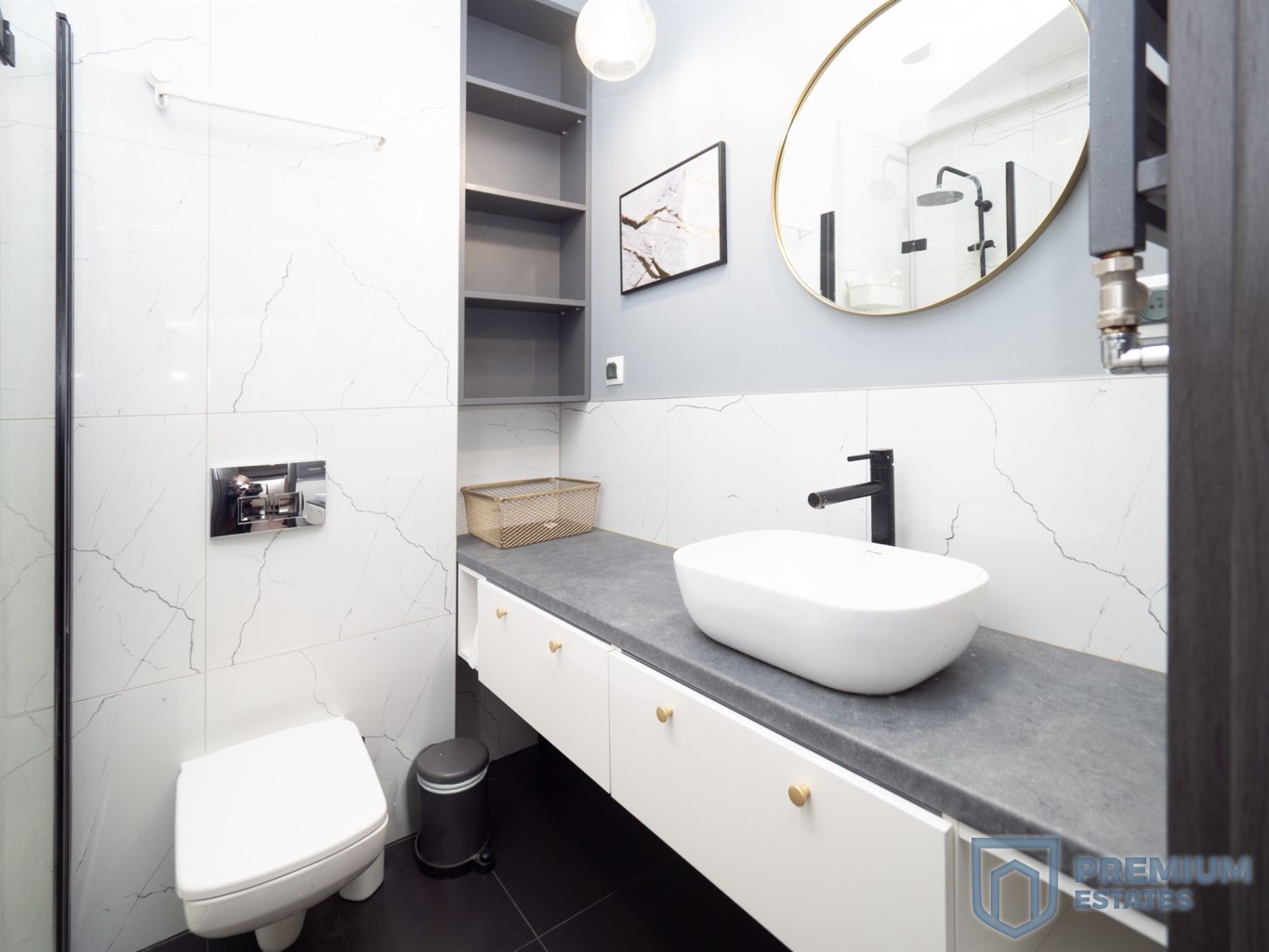 Łazienka oferuje prysznic, elegancką umywalkę nablatową, lustro i praktyczną zabudowę na wymiar.