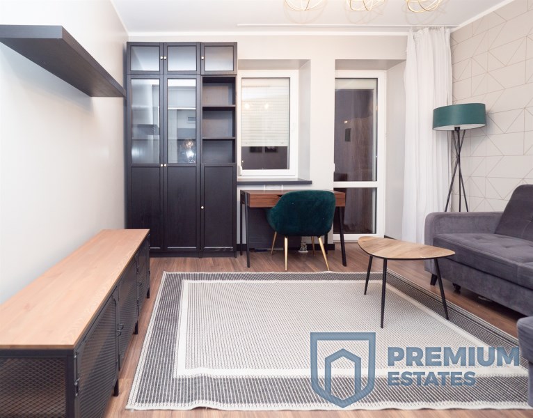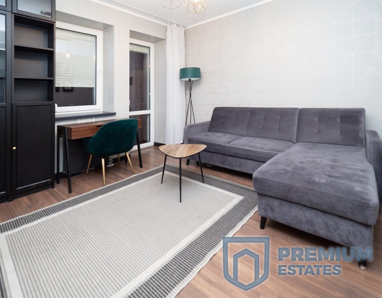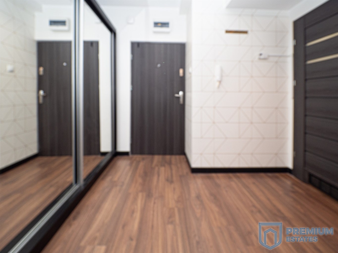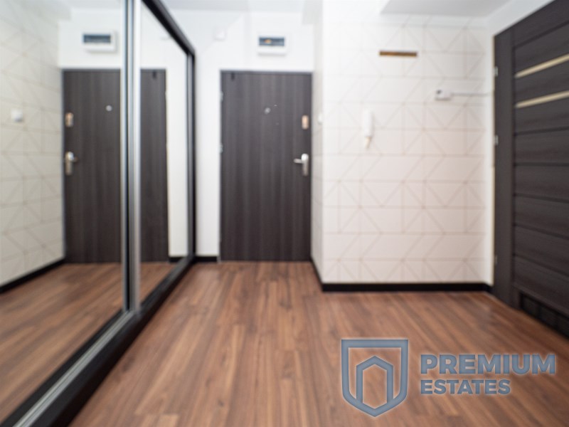 W przedpokoju znajduje się pojemna szafa z lustrzanymi frontami, natomiast w pokoju dziennym — rozkładana kanapa, biurko, stolik kawowy oraz przeszklona witryna.
