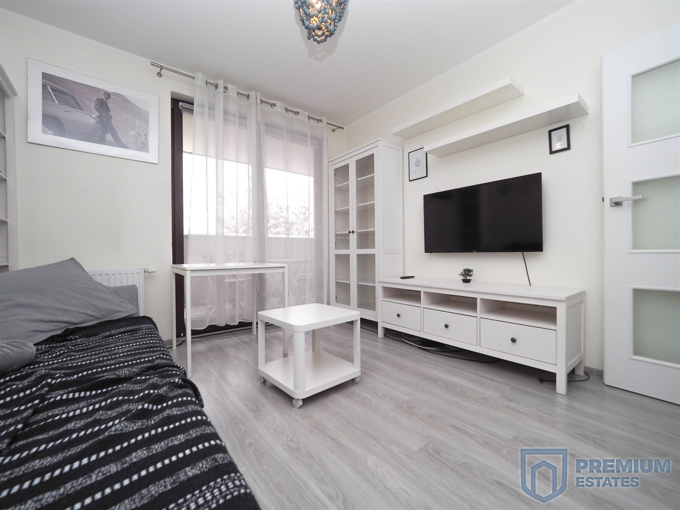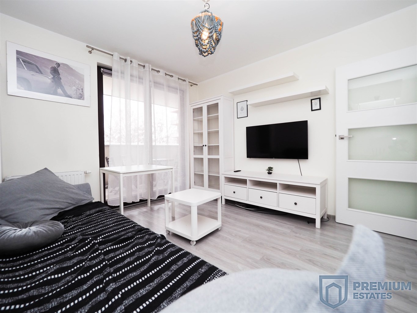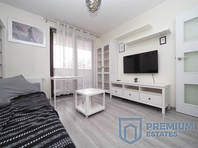 - Salon wyposażony w kanapę, telewizor, stolik - z wyjściem na balkon