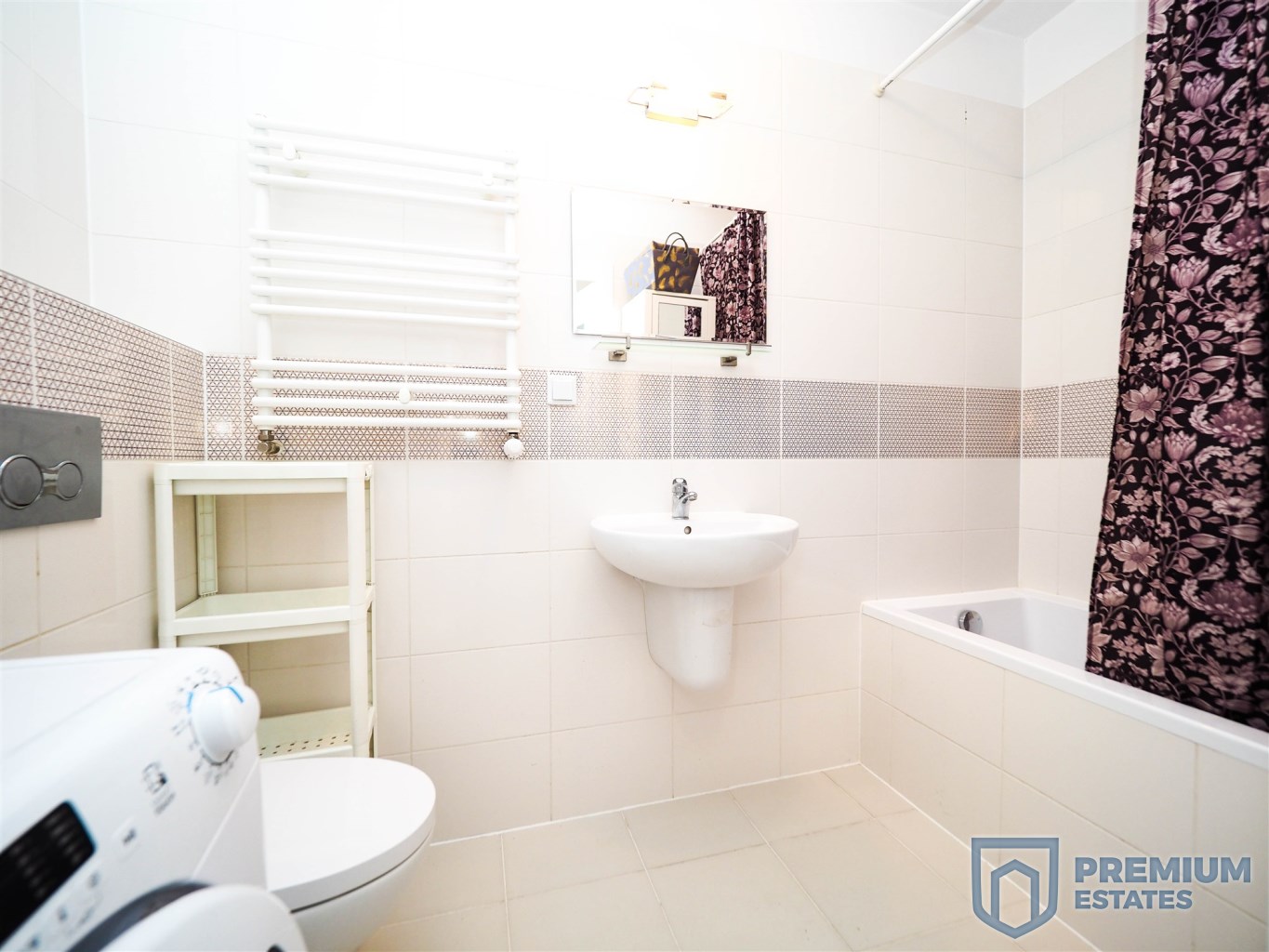 - Łazienka wyposażona w wannę z funkcją prysznica, wc, umywalkę, meble oraz pralkę