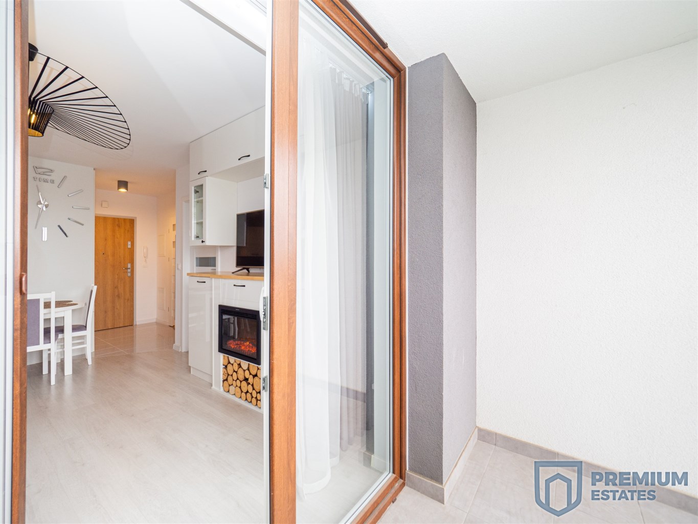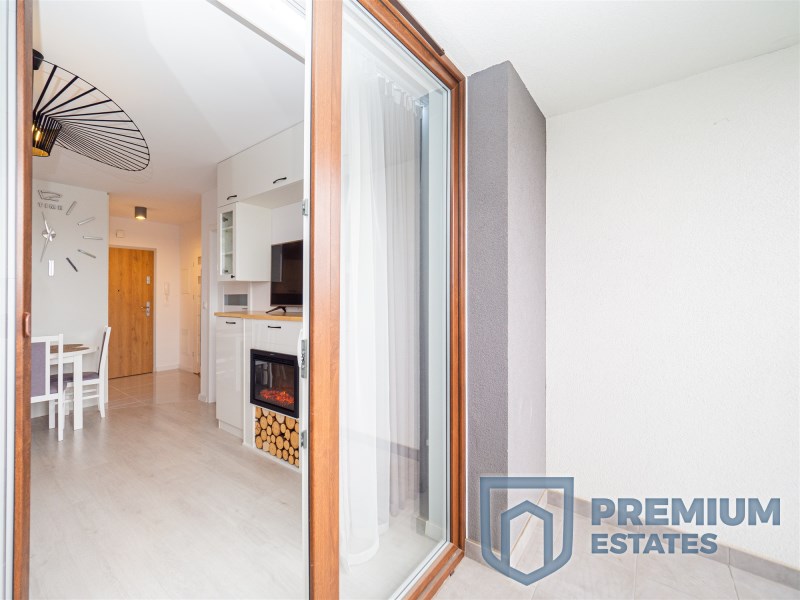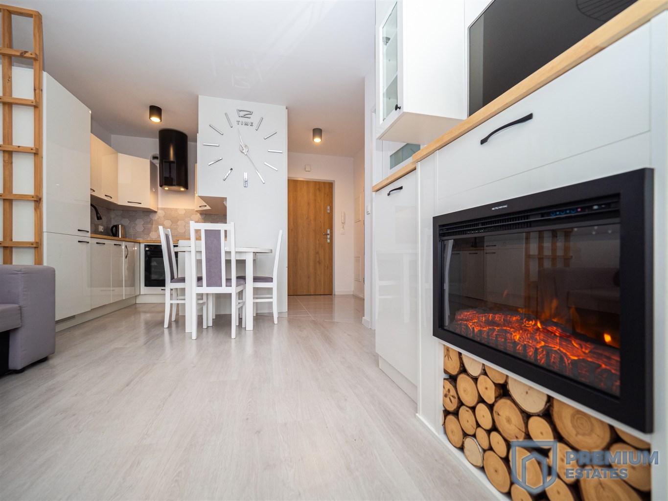 Klimatyzacja. Designerska lampa sufitowa, oświetlenie LED oraz kominek nadaje niezwykłego uroku całemu pomieszczeniu. Z salonu wyjście na balkon.