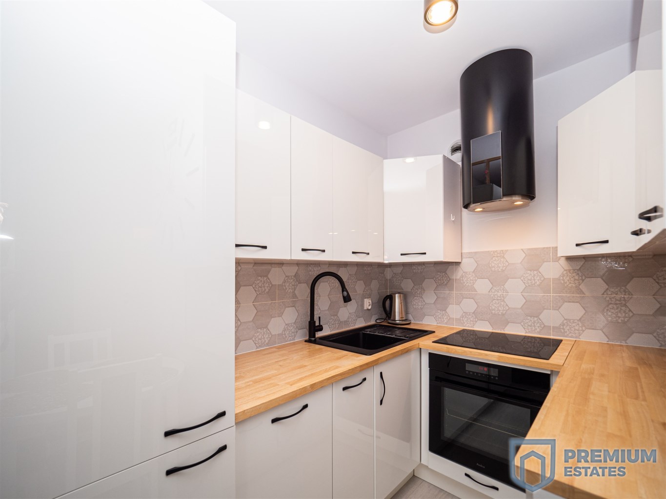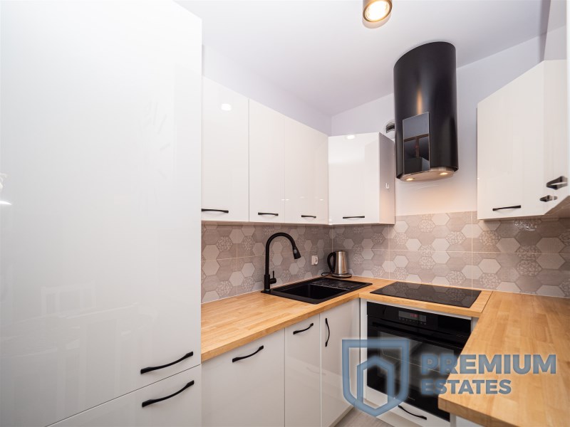 kuchennej znajdziemy lodówko-zamrażarkę, zlew z dotykową baterią, dotykowy okap, piekarnik, zmywarkę 45 cm, płytę indukcyjną 4-palnikową, wyposażenie drobne tj. garnki, sztućce itp., a całość w zabudowie meblowej na wymiar.