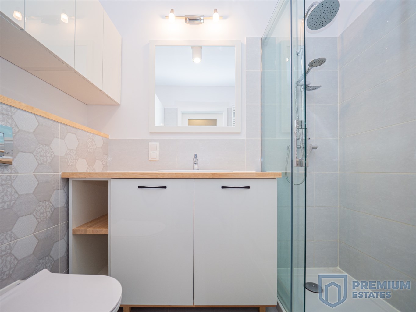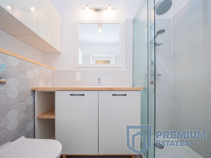 łazience znajdziemy kabinę prysznicową, nową pralkę (niewidoczna na zdjęciach- w trakcie zakupu), umywalkę, lustro, szafki, półki.