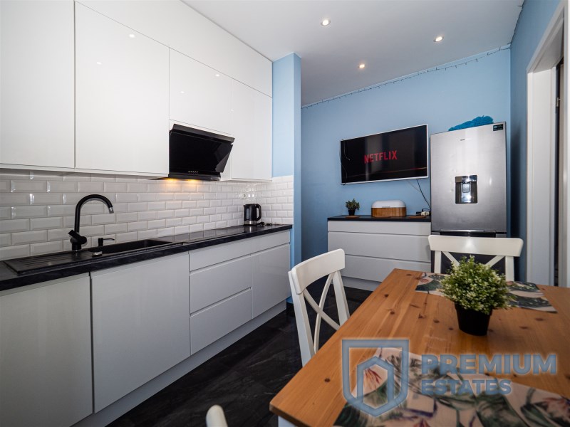 W pełni wyposażona kuchnia (lodówka, piekarnik, płyta grzewcza, mikrofalówka, zmywarka, telewizor) z wyjściem na taras (16,49 m2),