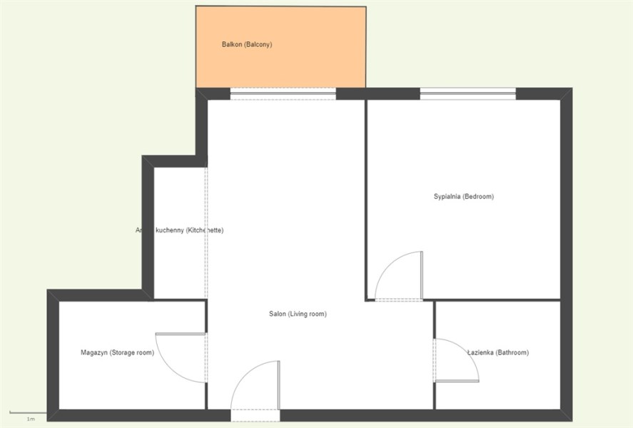 salon z aneksem kuchennym oraz wyjściem na balkon
