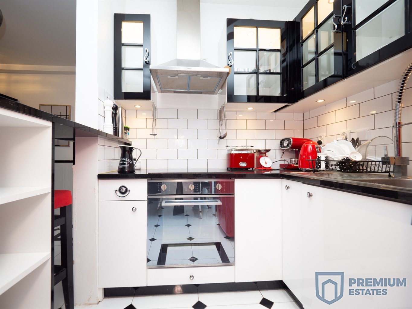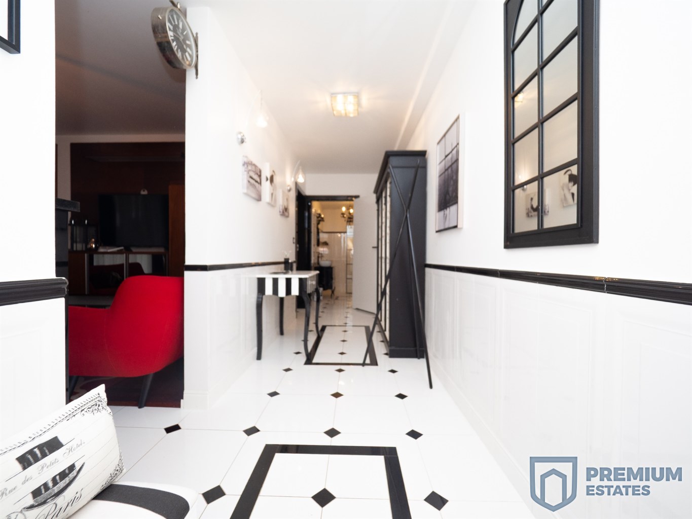 The apartment is located on the ground floor and has been decorated in an elegant black-and-white color scheme with red accents. The interior was designed with attention to every detail, using the highest quality materials and appliances.