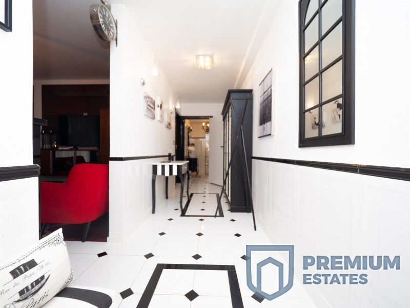 The apartment is located on the ground floor and has been decorated in an elegant black-and-white color scheme with red accents. The interior was designed with attention to every detail, using the highest quality materials and appliances.