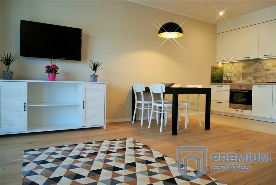- Salon wyposażony w sofę, stół z 4 krzesłami oraz TV.