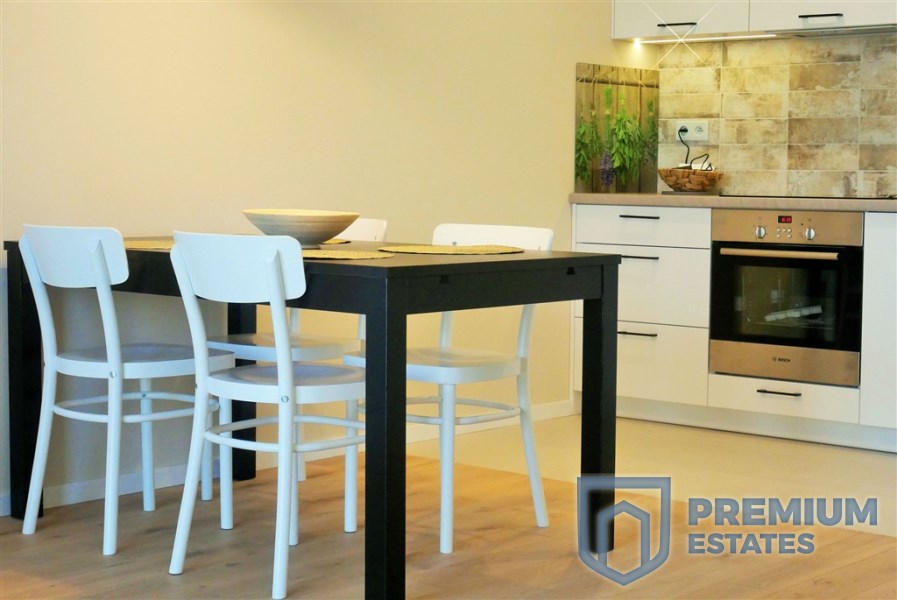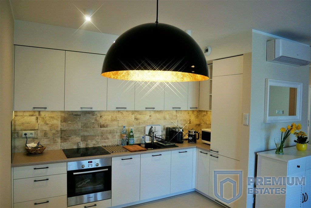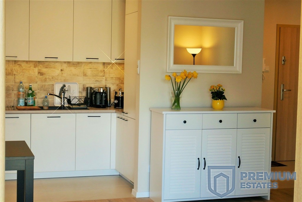- Kuchnia wyposażona w meble w zabudowie kuchennej, piekarnik, zmywarkę, płytę ceramiczna, chłodziarko-zamrażalkę, jednokomorowy zlew, toster, czajnik oraz ekspres do kawy.