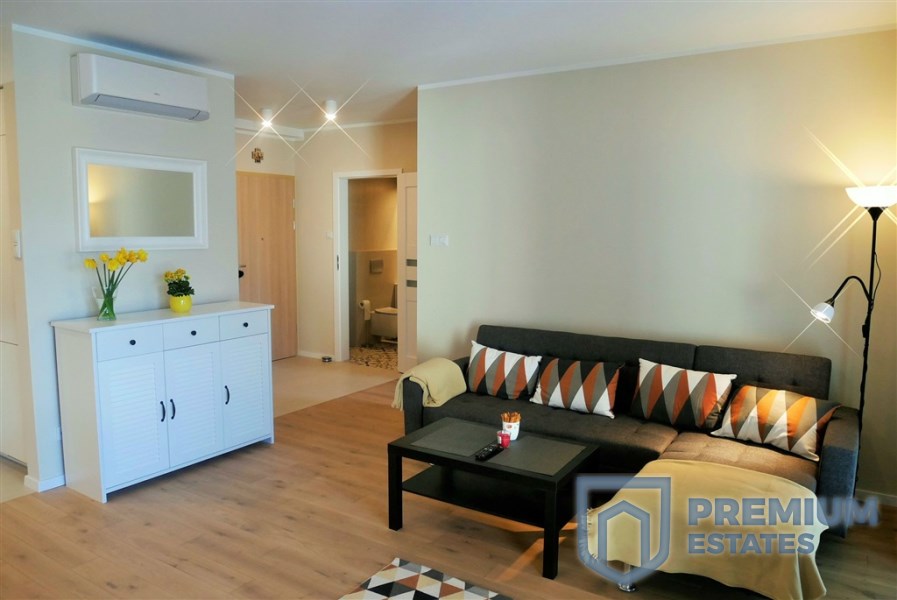 Składa się z salonu z aneksem kuchennym, sypialni, przedpokoju oraz łazienki.