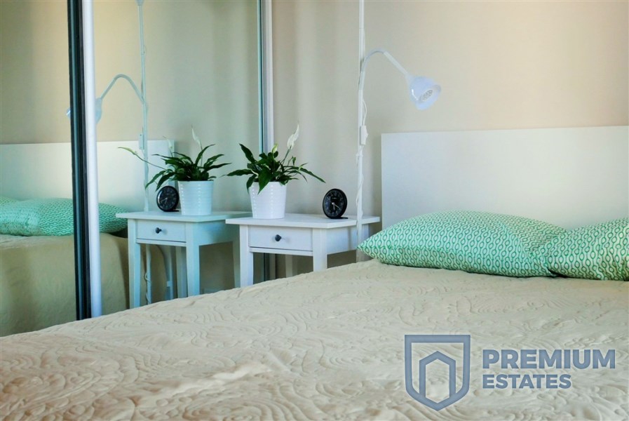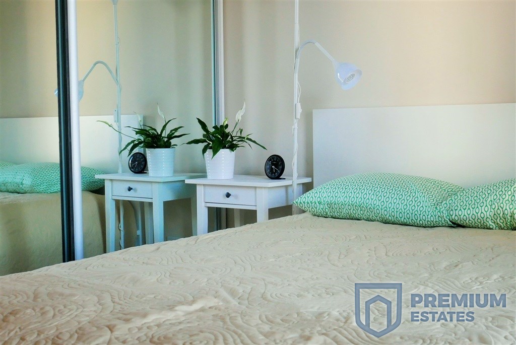 - W sypialni duże podwójne łóżko, 2 szafki nocne oraz szafa garderobiana.