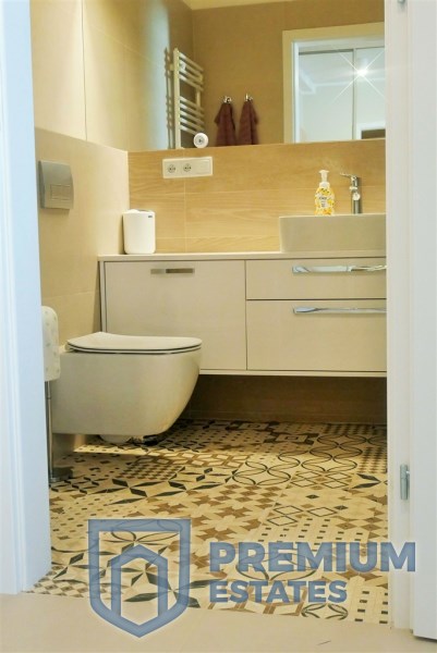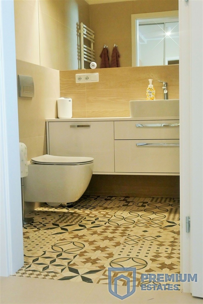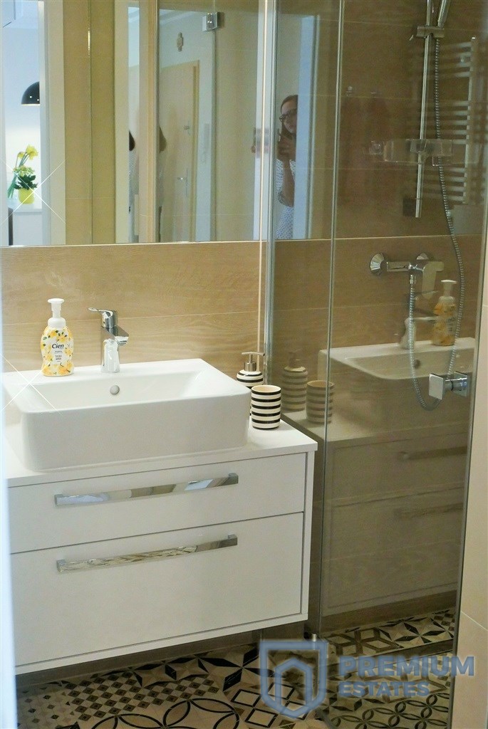 - W łazience kabina prysznicowa, umywalka, pralka, grzejnik drabinkowy, WC i duże podświetlane lustro.