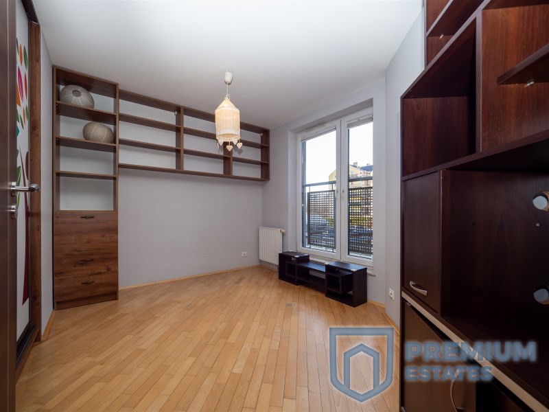 - Pokój dziecięcy lub gabinet z zabudowaną szafą, regałami. Możliwość dostawienia łóżek dziecięcych lub biurka.