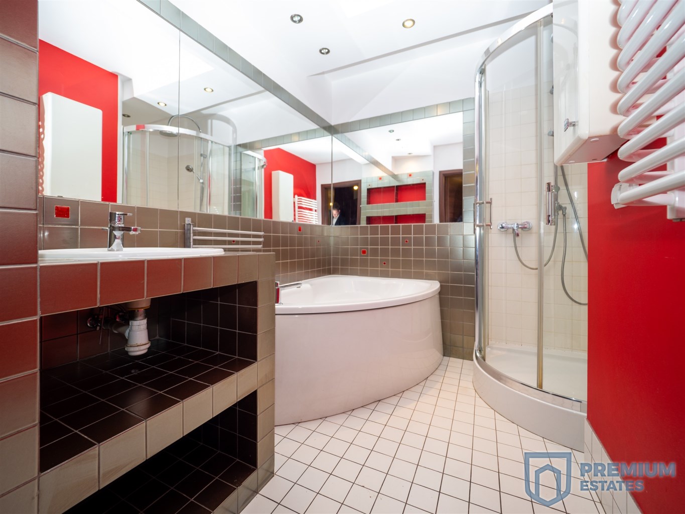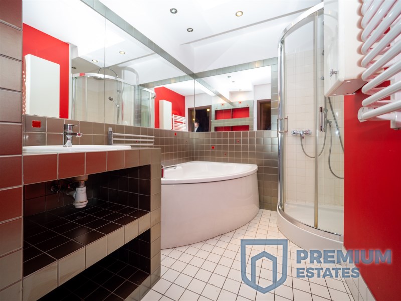 - Łazienka z dużą kabiną prysznicową, wanną narożną, umywalką oraz szafkami.