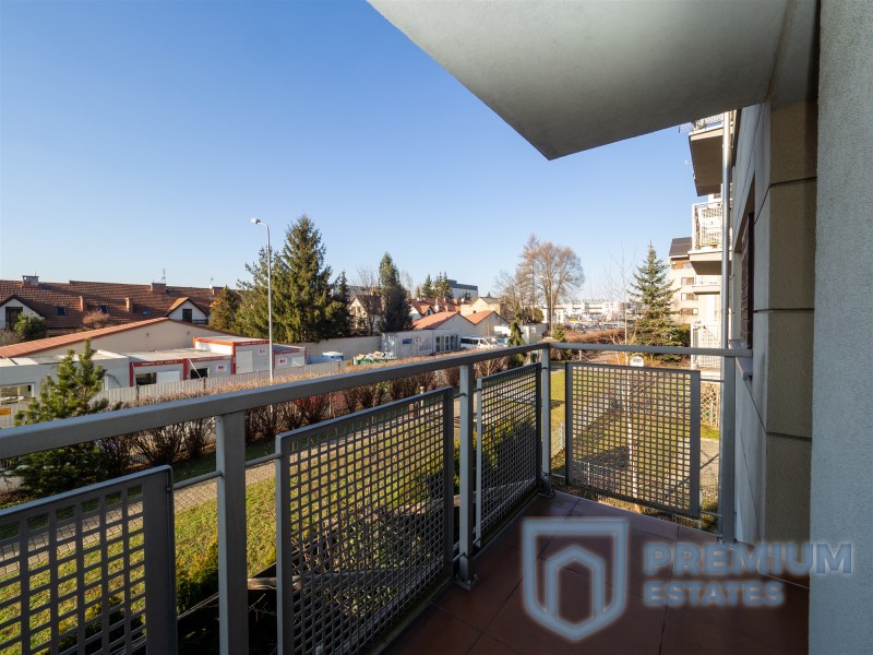 Z salonu znajduje się wyjście na duży balkon, gdzie widok rozpościera się na osiedle.