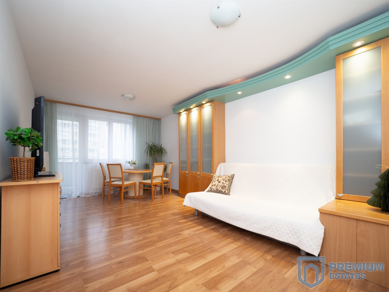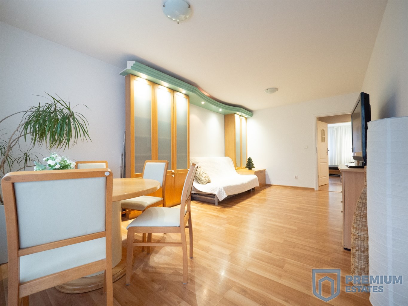 – salon z rozkładaną kanapą oraz częścią jadalnianą,