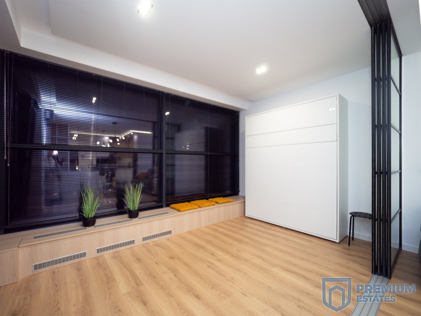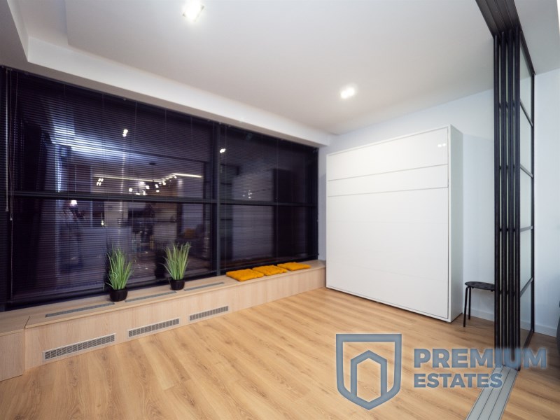 The apartment is finished to a high standard, with top-quality materials. The bedroom features a large, full-size foldable bed. Thanks to numerous windows, the interior is bright and filled with natural light.